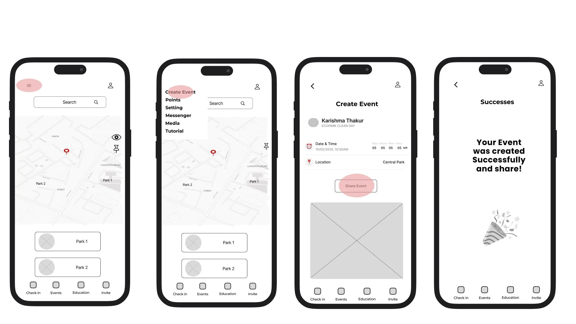 The EcoPark wireframes showcase a clean, user-friendly layout designed for easy navigation. They highlight key features like event sign-ups, calendars, and profiles, making community participation in park clean-up efforts simple and engaging.