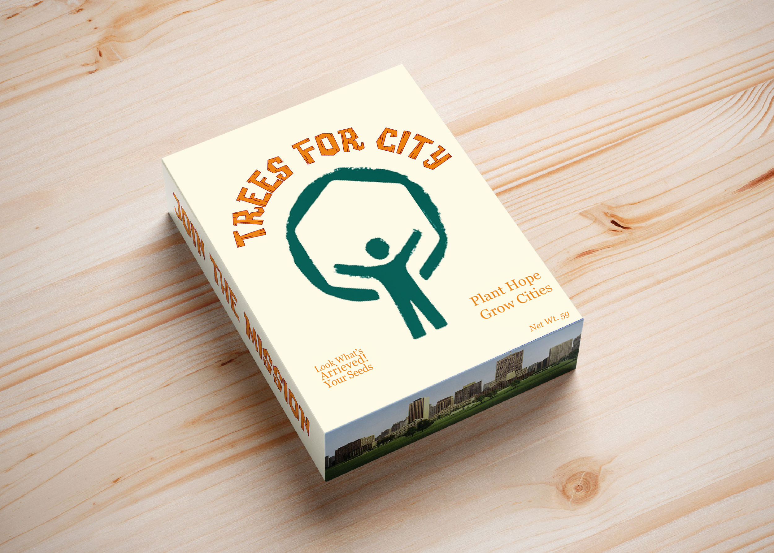 To develop a multi-package concept for the charity Trees for Cities, promoting urban reforestation through visually compelling and functional designs. The package incorporates eco-friendly materials, container designs, and mockups, emphasizing the significance of tree planting in urban environments while enhancing the initiative’s visual impact.